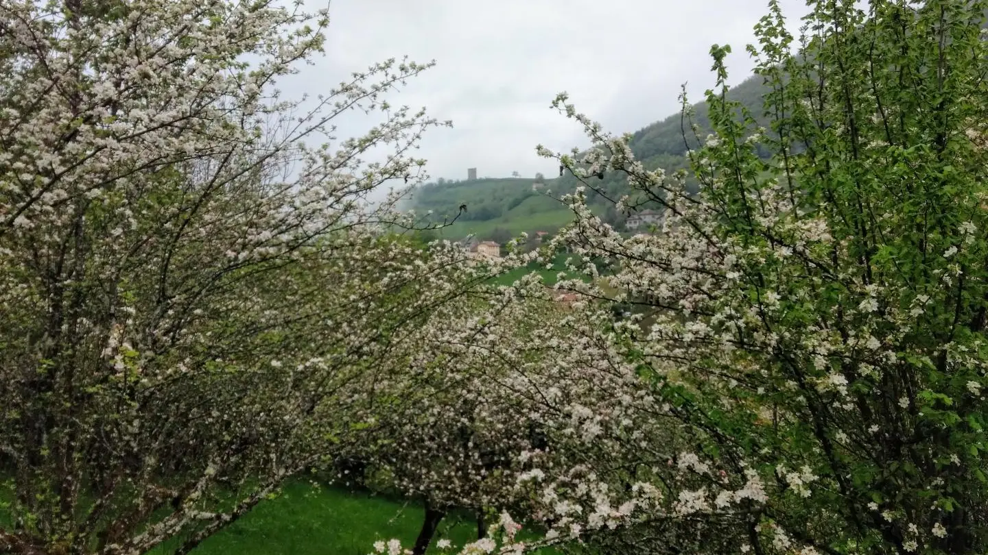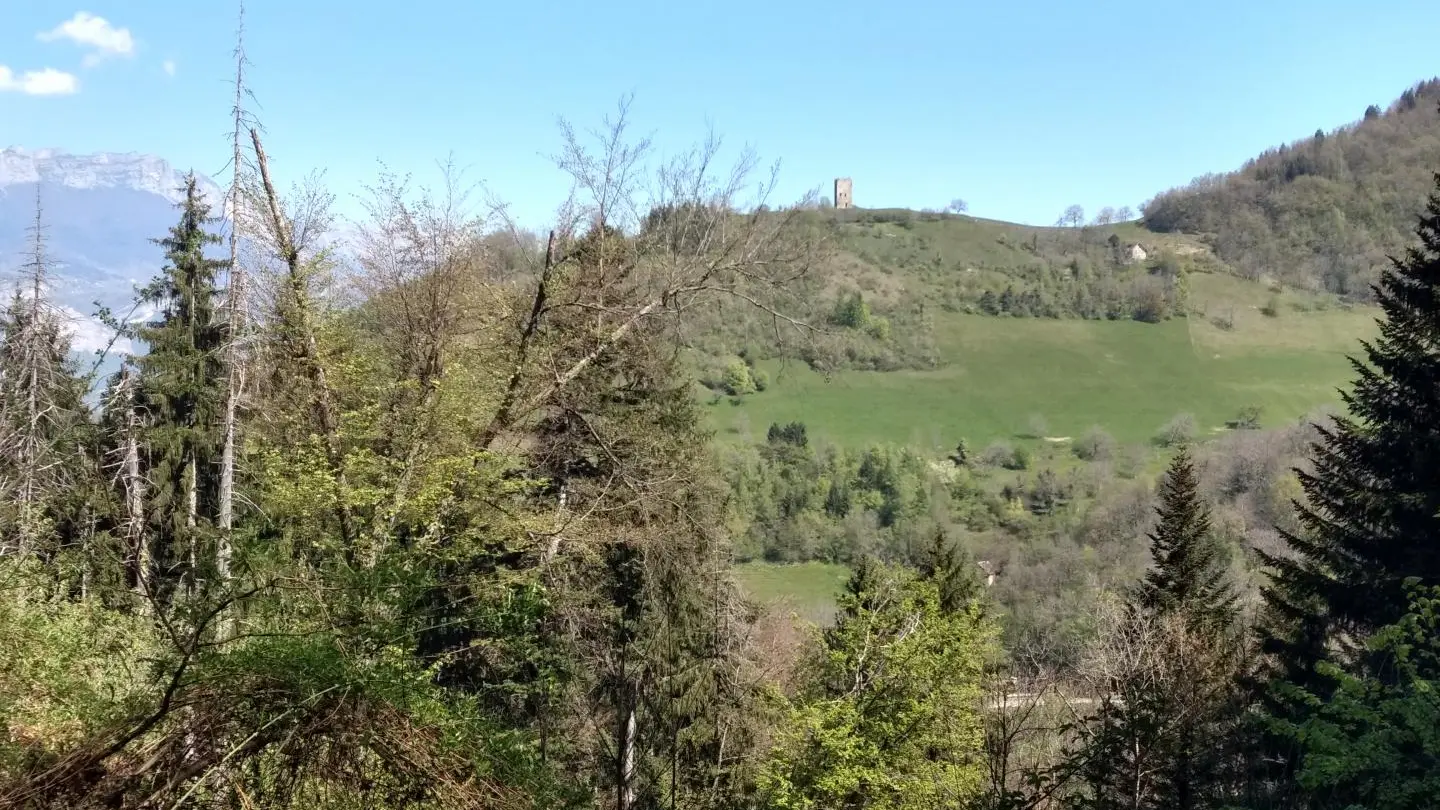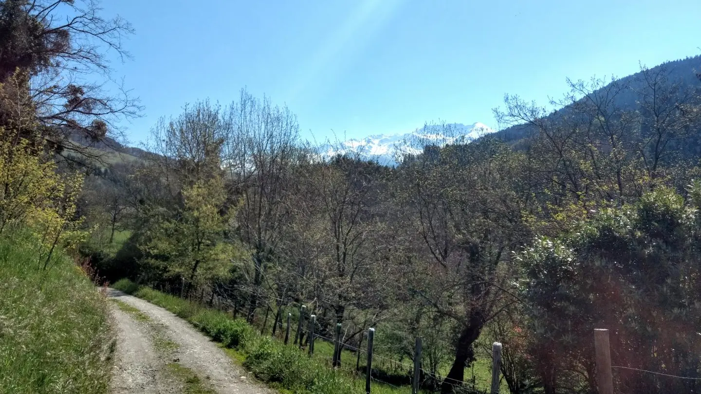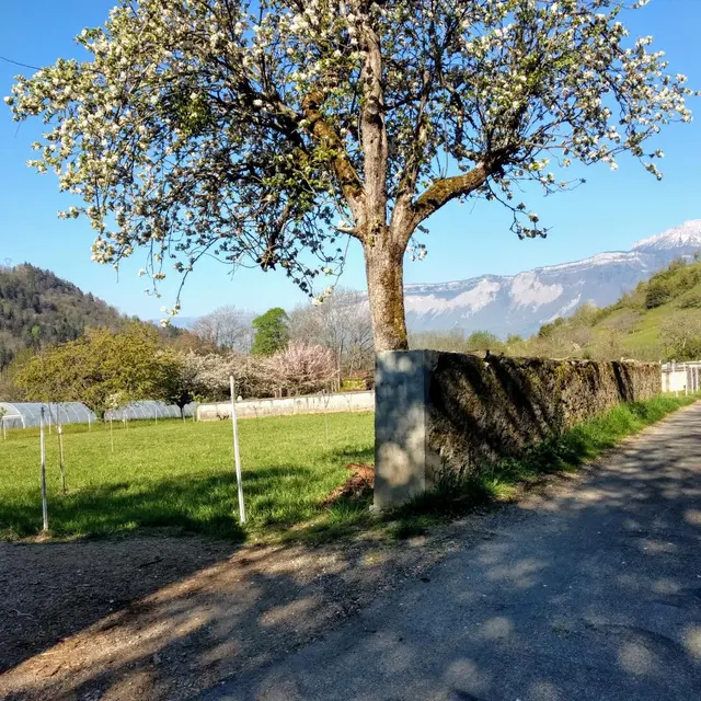 4,02 km - Prenez le chemin qui part tout droit vers Laval et pratiquement de niveau. Profitez d'un peu de répit en prenant le temps du magnifique point de vue sur Prapoutel la station Les 7 Laux, les sommets de Belledonne dont le Dôme des Oudis, Jas des lièvres et le Ferrouillet à plus de 2500 m. Vous pourrez rendre une petite visite à Léa, la maraîchère bio fraîchement installée derrière le cimetière qui vend sur place ou au marché de Laval le mardi soir à partir de 16h30.