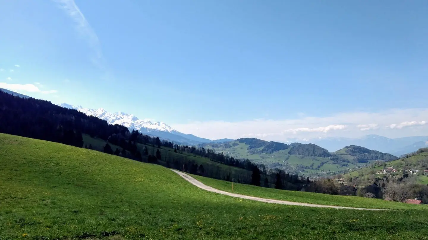 8,0 km - Au carrefour, vous êtes au point le plus haut de ce circuit à plus de 920 m. Vous avez grimpé plus de 330 m de dénivelé positif. Vous avez bien le droit à une petite pause, profitez du superbe panorama sur toute la vallée de Theys et au fond, on distingue le massif du Vercors et sur la droite le massif de la Chartreuse.