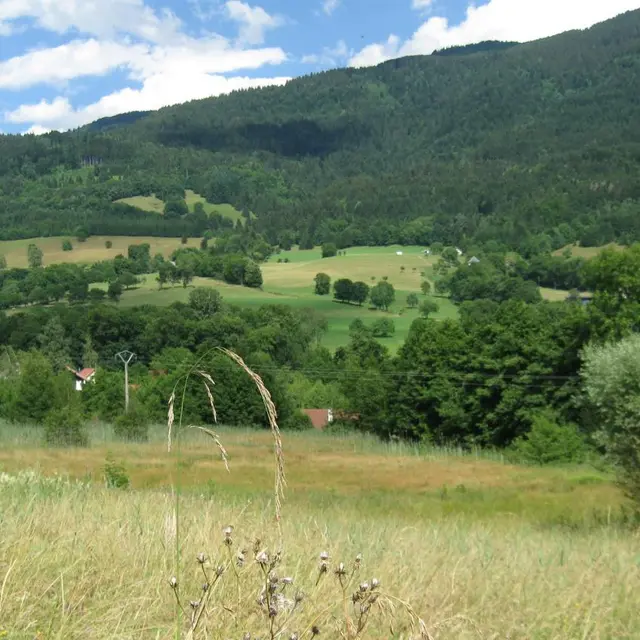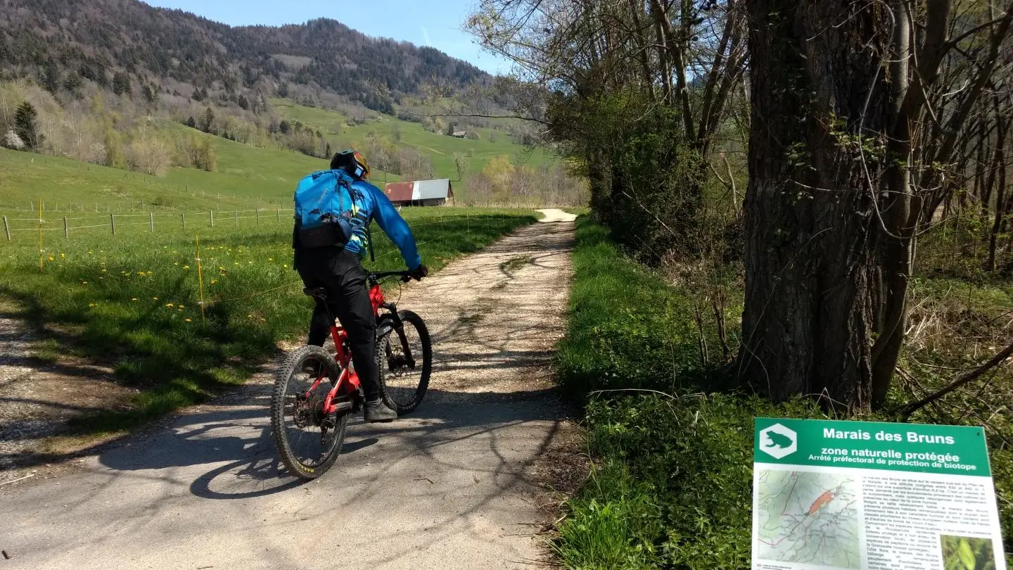 5,9 km - La route goudronnée devient gravier et vous arrivez enfin à la zone protégée du Marais des Bruns à une altitude de 830 m. La découverte d’une orchidée rare, l’orchis musc (Herminium monorchis) en 1995 a permis de mettre en évidence l’intérêt de cette zone humide. Il couvre une surface approximative de 9 hectares. Le marais est alimenté en eau par l’écoulement du bassin versant et par quelques résurgences. Il est constitué par deux petites mares sous des saules, une forêt de frênes et d’aulnes, des roselières, des prairies sèches et des prairies humides régulièrement fauchées. Labellisé ENS (espace naturel sensible), il présente une grande biodiversité avec plus de 400 espèces végétales et animales dont une petite dizaine à fort enjeu de préservation. Le chemin fait un virage à angle droit vers la droite. A cet endroit, vous pouvez voir le château de La Penelle datant du XVIe mais complètement remanié au XVIIIe et vendu comme bien national à la Révolution.