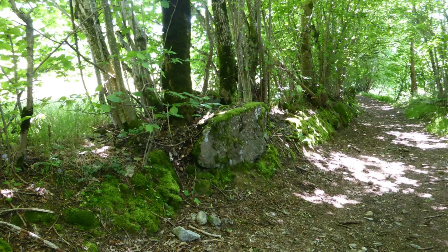 8,0 km - Partez à droite et prenez le joli petit chemin de terre bordé d’arbustes et de pierres dressées. Il s’appelait autrefois « Vy (voie) des ânes » car c’était le chemin emprunté par les mules qui descendaient le minerai de fer et de cuivre des mines situées sur le côteau. C'est un sentier bien agréable avec un peu de pierres que vous passerez sans problème si vous n'êtes pas totalement débutant. Sinon n'hésitez pas à mettre pied à terre et à prendre votre temps. Vous arrivez au GAEC Ferme de Belle Etoile, un éleveur de bovins laitiers y produit et vend sur place fromages blancs, tommes, yaourts, viande bovine, noix, huile...