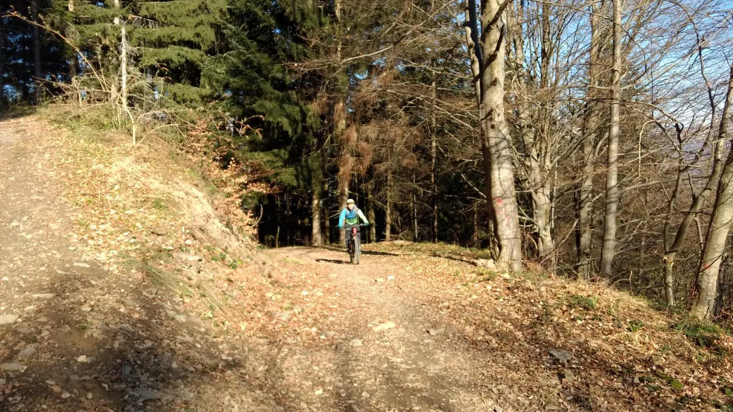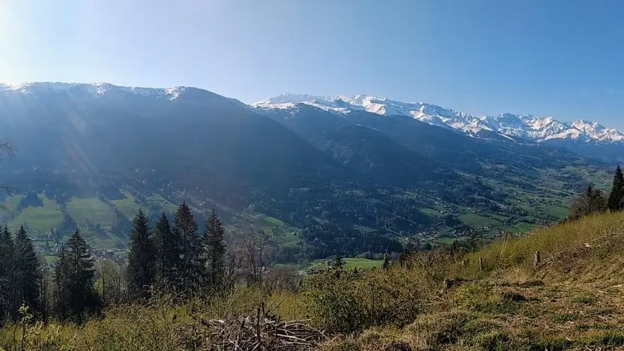A 6,7 km - Plutôt que d'aller tout droit (direction Ruche, Sollières, col du Barioz), vous prendrez le chemin à droite qui vous monte sur la crête du plan de la Malade. Vous avez un magnifique panorama sur la vallée de Theys, le massif de Belledonne et la Station des 7 Laux. Vous avez ensuite un petit jeu d'orientation assez ludique dans les bois pour trouver le point le plus haut du parcours à 1130 m (indice: vous n'avez qu'à suivre la trace). En récompense, vous avez ensuite droit à une belle descente bien engagée par endroits sur 1 km et 110 m de D- pour rejoindre le km 4,2 (noté plus haut).