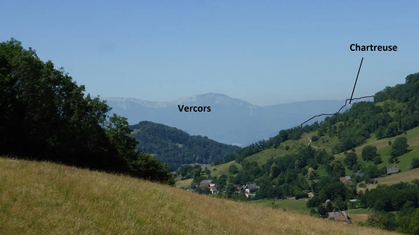 A 14,5 km - Au carrefour, vous êtes au point le plus haut de ce circuit à plus de 920 m. Vous avez grimpé plus de 330 m de dénivelé positif. Vous avez bien le droit à une petite pause, profitez du superbe panorama sur toute la vallée de Theys et au fond, on distingue le massif du Vercors et sur la droite le massif de la Chartreuse.