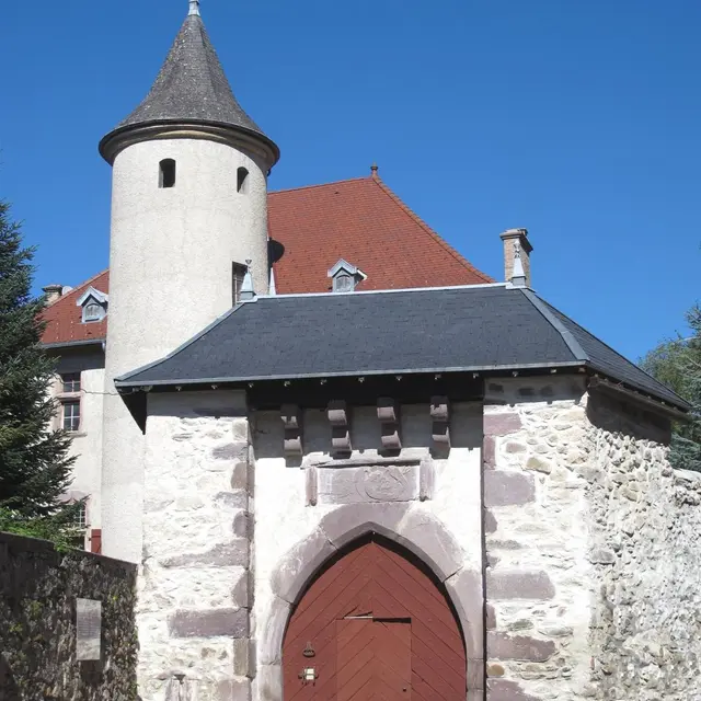 A 0,5 km - Remontez la rue qui part à droite vers le château Jail construit fin XVe. Remarquez le porche fortifié et sa porte en bois qui est encore plus admirable du côté de la rue du Chêne. A droite du porche et en renfoncement, vous pourrez découvrir la vitrine de l’écomusée où sont exposés des outils et objets d’autrefois. A la jonction avec la rue du Chêne, prenez à gauche la route qui remonte vers le col du Barioz et continuez toujours tout droit.